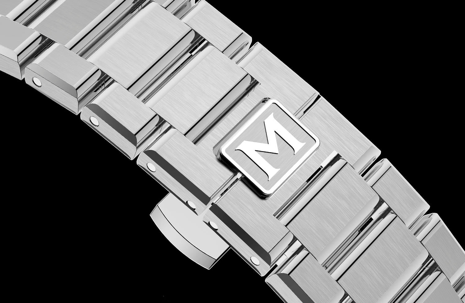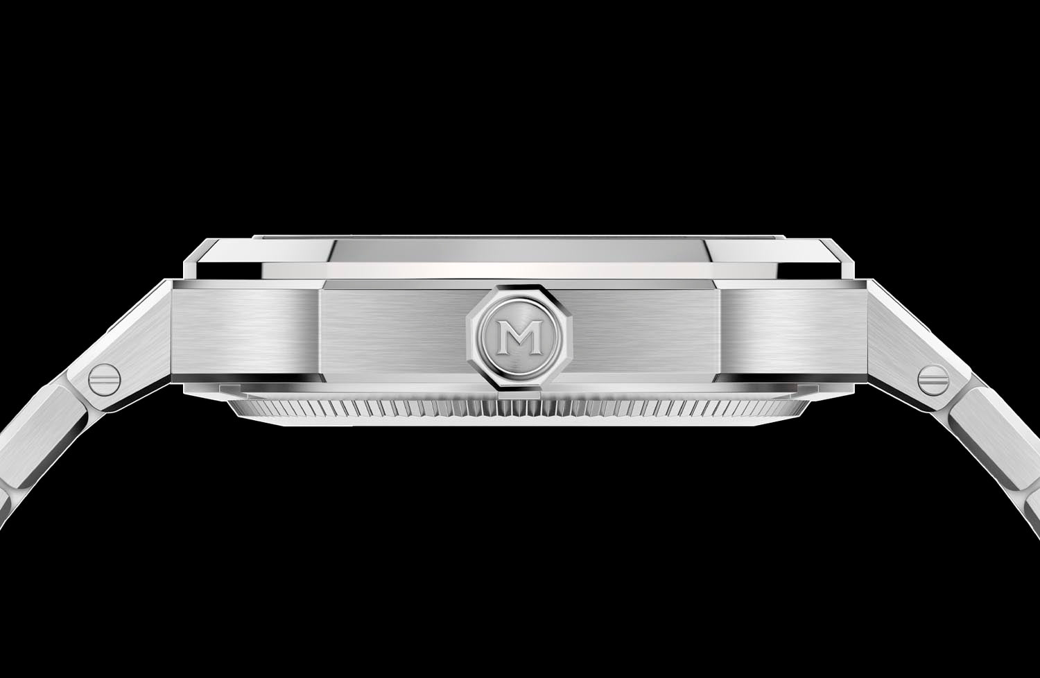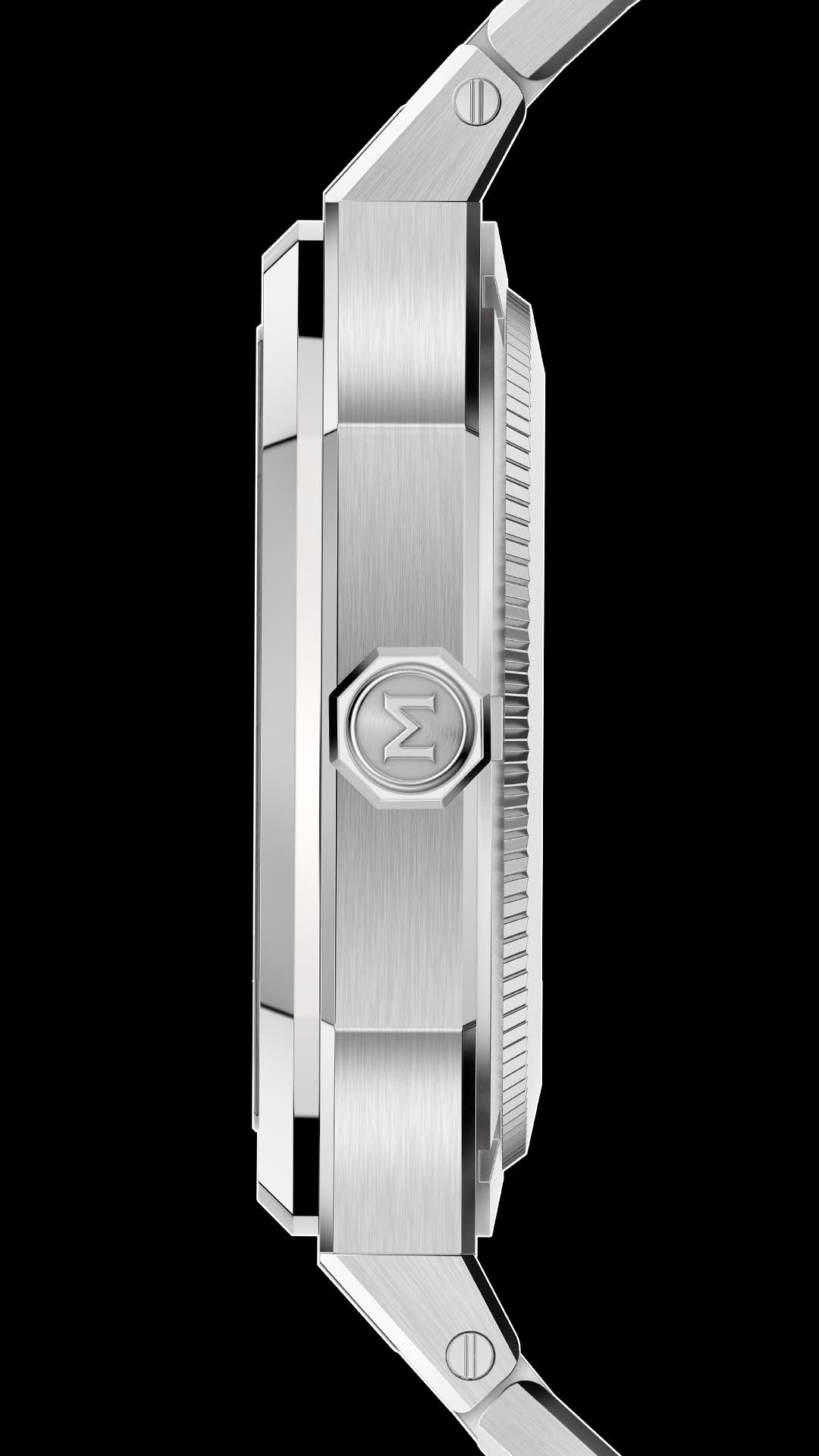 With its steel case, vertically elongated octagonal bezel, Côtes de Genève dial and integrated bracelet, the Manhattan37packs a lot of punch. Due to the integrated design the watch wears larger than its modest 37 mm would suggest.