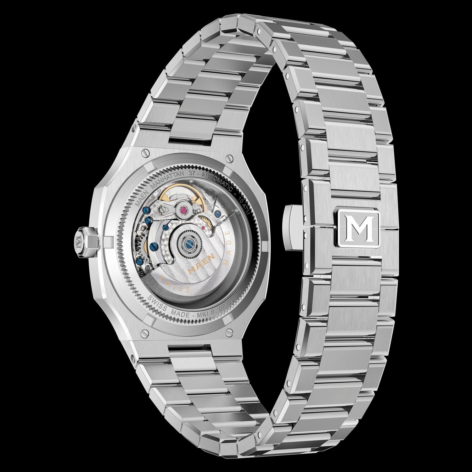 The Manhattan 37 is now also available with Top Grade Sellita SW200-1 movement. The rhodium plated, fully decorated movement with blued screws can be admired through the open caseback which is exclusively available in combination with this movement.